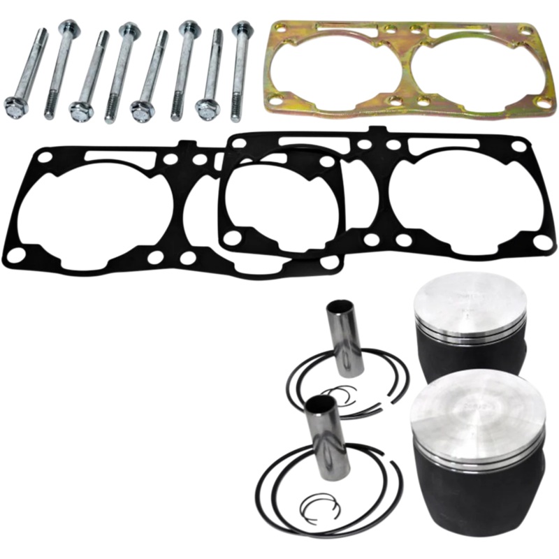 Custom designed taller pistons have less piston slap. Rings have been spaced apart for better cooling. Pistons have .020″ wrist pin offset to take load off the intake side. Forged pistons are more durable and collapse less than factory pistons. Lubrication holes in the skirt of the piston designed to lengthen piston skirt life. Friction-resistant coated pistons. Gains 6-7 hp and even more for motors down on compression. A must have for motors with over 1500 miles on stock pistons. No EFI controller required. Includes pistons, rings, circlips, wristpins, cylinder bolts, cylinder spacer, longer alignment pins, and two base gaskets.