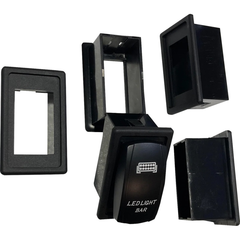 5 piece plastic rocker switch adapter kit allows the use of Brite Lites Deluxe Rocker switch wiring harnesses to be installed in the new Polaris UTVs with the slightly large factory knockout hole in the dash. The adapter slips over the rocker switch to fil
