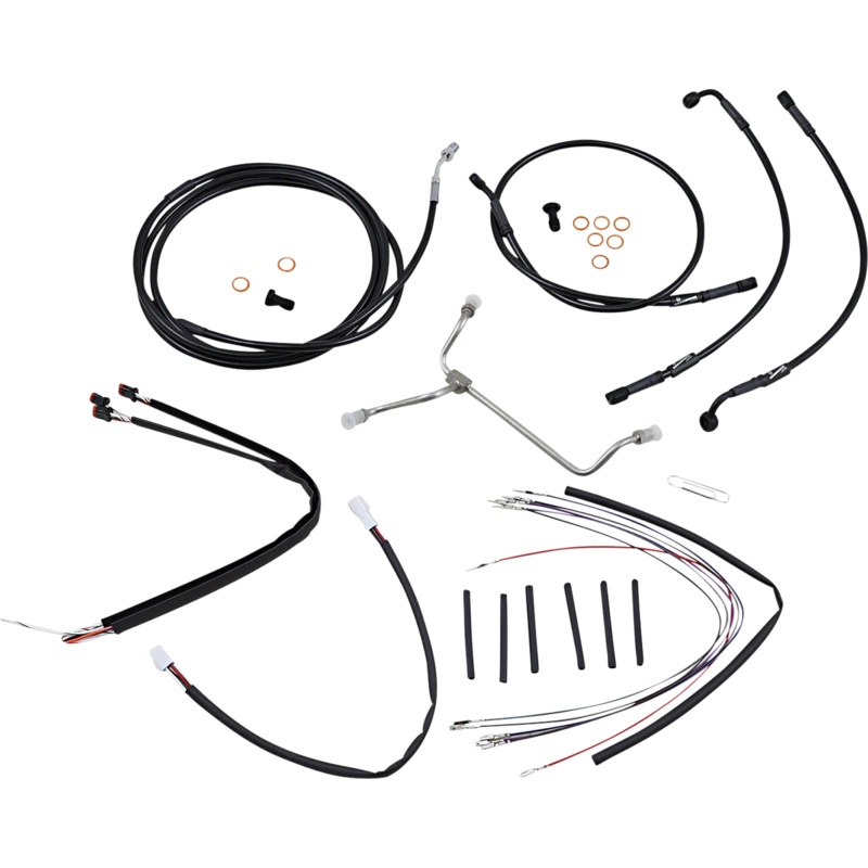 Complete installation kit for Burly Ape hangers. Kit includes extended brake line (unless noted), extended clutch cable/clutch line, extended throttle/idle cables as required and all necessary wiring. Brake lines, when included, feature PTFE inner liner and heavy-duty stainless steel outer braid. Dresser kits reuse stock Throttle-By-Wire harness. Kit is based on using 2″ risers with ape hanger-style handlebars..