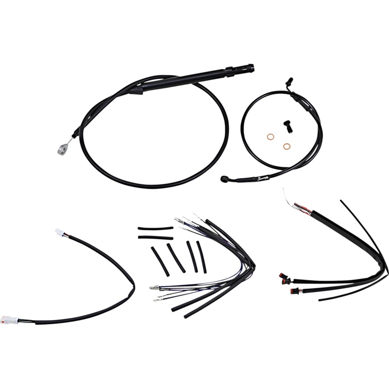 Complete cable/line installation kits. Kits include extended brake line, extended clutch cable/clutch line, extended throttle/idle cables as required and all necessary wiring extensions. Brake lines feature PTFE inner liner and heavy-duty stainless steel outer braid. Made in the U.S.A.. Kits are based on using 2 risers with Ape hanger-style handlebars.