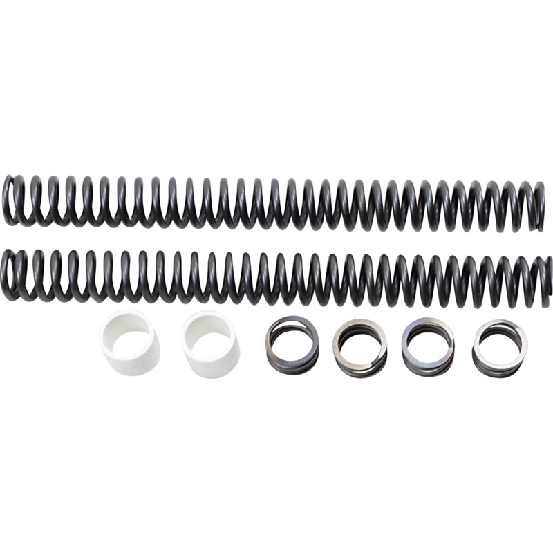 The quickest and easiest way to lower front forks by 1-1/2". Comes with two chrome compression springs, spring spacers and bushings.