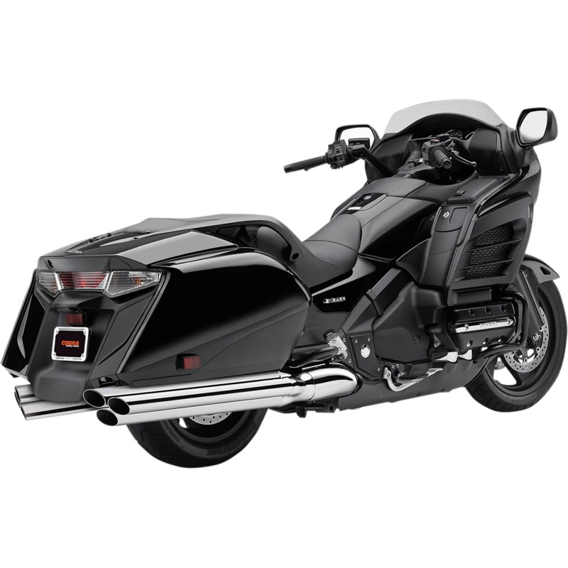 Emphasizes the six cylinders that power the classic Gold Wing engine. Feature three separate bodies on each side giving the bike six pipes total; each of the three muffler bodies measures 2-1/4″ in diameter. Each of the three pipes on each muffler ties into a three-into-one collector. The gigantic, clover-leaf shaped collector locks each tube into perfect position, while a system of unseen brackets ties the pipes together at the rear. Designed so each pipe’s arched bend matches the bike’s bags, creating perfect visual symmetry. While louder than stock, they are still well within acceptable sound levels. Made in the U.S.A.. Uses stock heat shields.