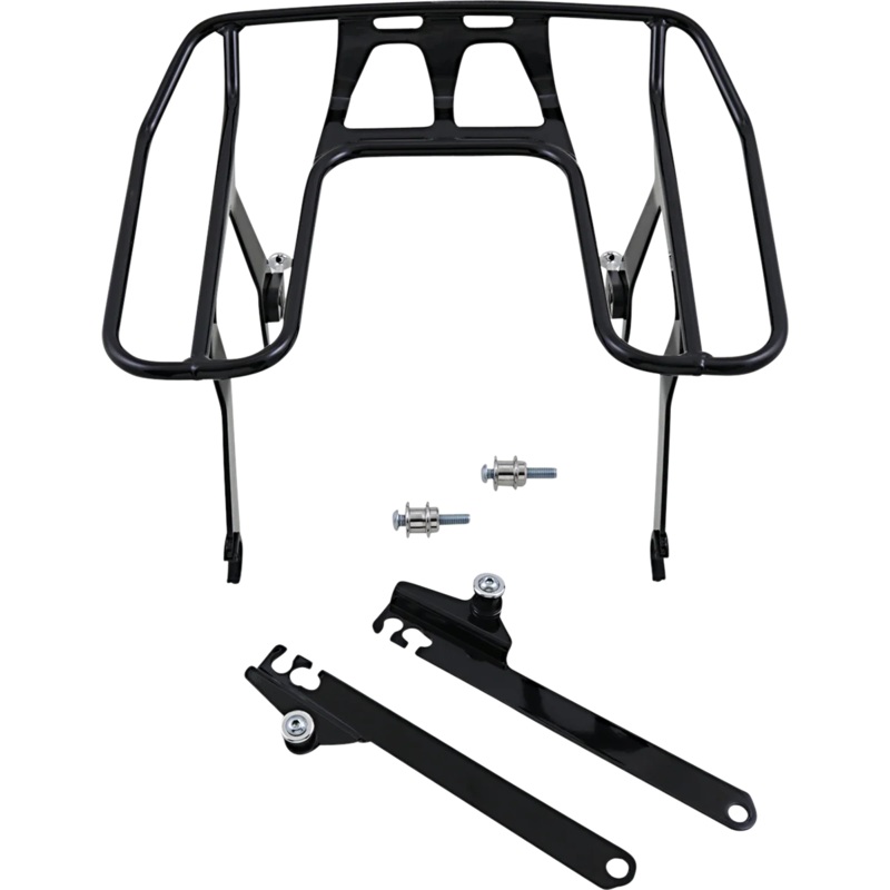 Top of the rack is about level with top of seat and each rack has a kick up in the rear. There are places to attach bungee cords or mounting straps so you no longer have to scratch your bikes fender as you secure your cargo. Mounting hardware included. Made in the USA. Does not work with nor require Harley-Davidson mounting kit.. If aftermarket seat is not Saddlemen or Lucky Daves step ups, then look carefully at the measurements of the opening to ensure the rack will fit around your bikes seat..