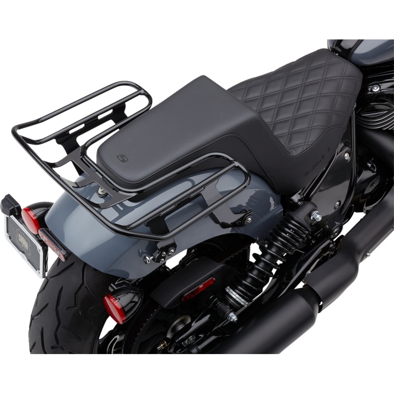 Top of the rack is about level with top of seat and each rack has a kick up in the rear. There are places to attach bungee cords or mounting straps so you no longer have to scratch your bikes fender as you secure your cargo. Mounting hardware included. Made in the USA. Does not work with nor require Harley-Davidson mounting kit.. If aftermarket seat is not Saddlemen or Lucky Daves step ups, then look carefully at the measurements of the opening to ensure the rack will fit around your bikes seat..