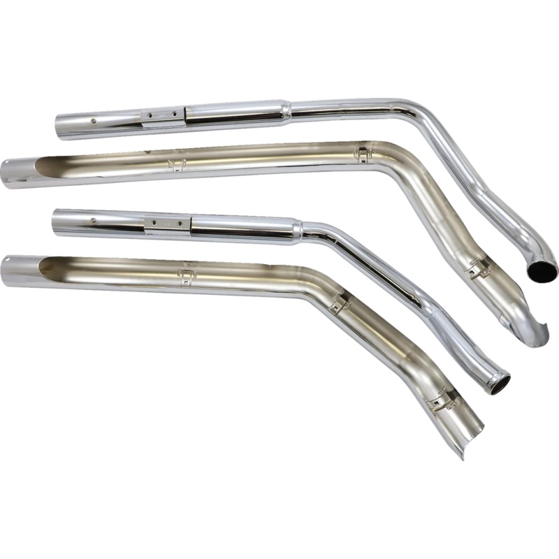 Perfect update to traditional drag pipes; maintains clean, pure drag-pipe appearance. Full-length, 2.5" heat shields with a 222 wrap around for a non-bluing appearance. Capped with machined and chromed billet tips. Removable performance cores. Power with s