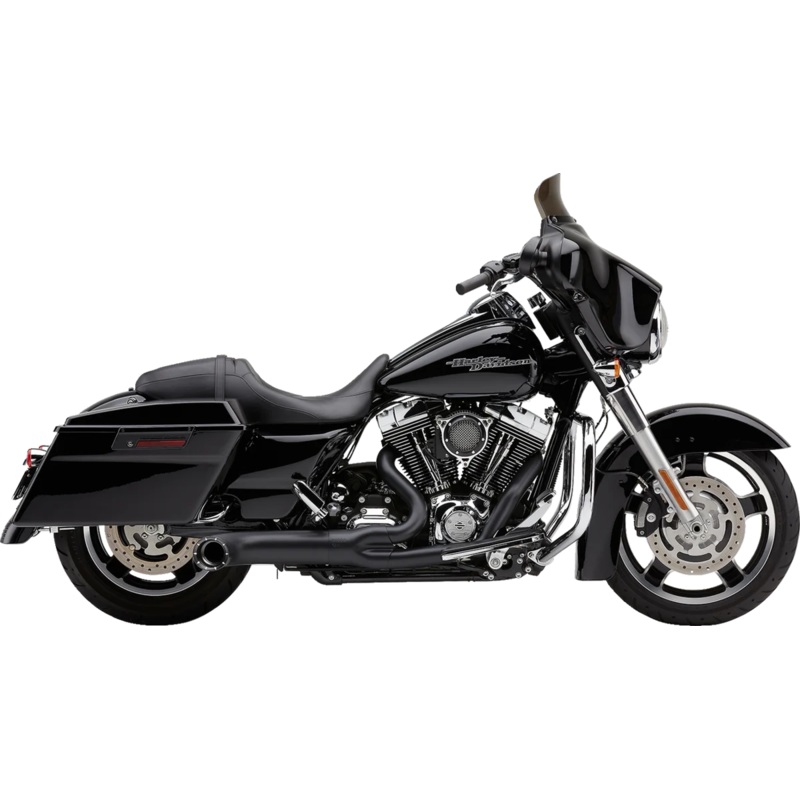 The headpipe merges into a large 2-1/4″ collector that steps up to a 2-1/2″ core. Core is perforated and wrapped in a stainless steel screen, then enclosed in a fiberglass pillow. 4″ muffler body capped with a 4″ machined aluminum dual-cut tip. Body can be rotated upward from its stock position. Works wtih stock or extended bags. Made in the U.S.A..
