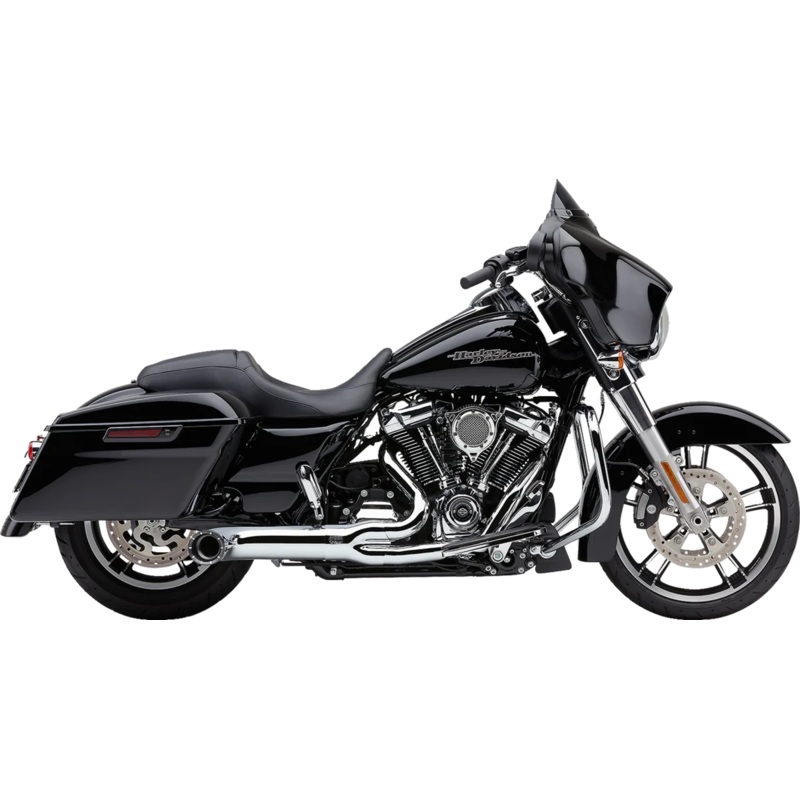 The headpipe merges into a large 2-1/4″ collector that steps up to a 2-1/2″ core. Core is perforated and wrapped in a stainless steel screen, then enclosed in a fiberglass pillow. 4″ muffler body capped with a 4″ machined aluminum dual-cut tip. Body can be rotated upward from its stock position. Works wtih stock or extended bags. Made in the U.S.A..