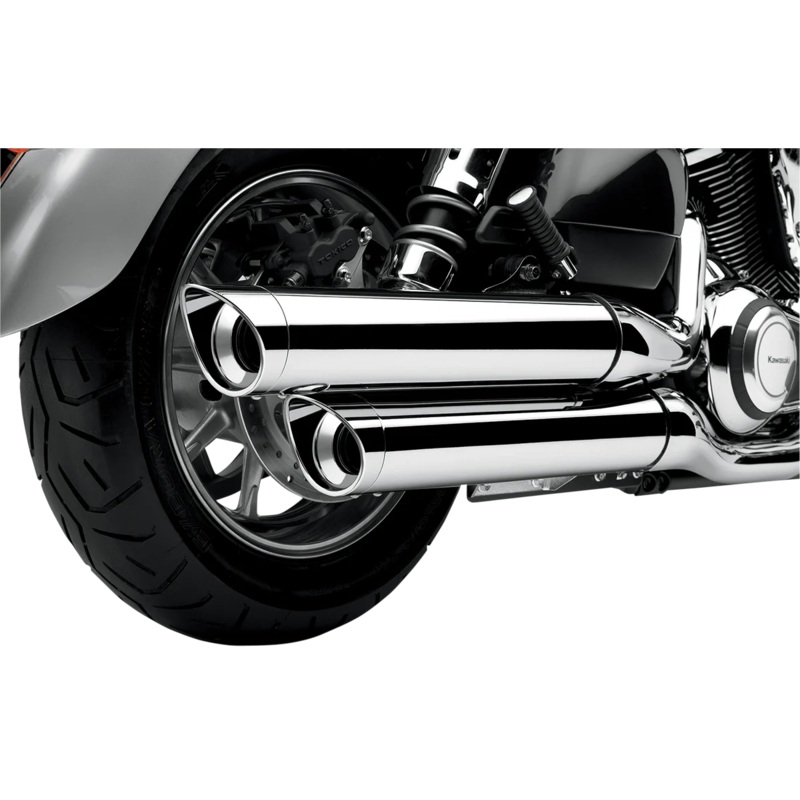 These 4-inch slip-on mufflers are a simple solution for a touch of custom look without a custom price or effort. These beautiful slip-ons are capped off with massive chromed billet tips. Features proprietary technology to prevent bluing, making these slip-
