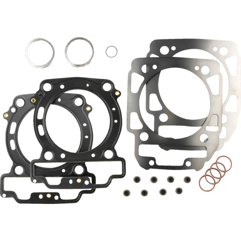 Top end gasket kit includes correct base, head gasket and cylinder O-rings as well as other top end specific O-rings or seals needed for R&R of top end. MLS head gaskets promote an even torque load across the gasket sealing surface, providing less bore dis