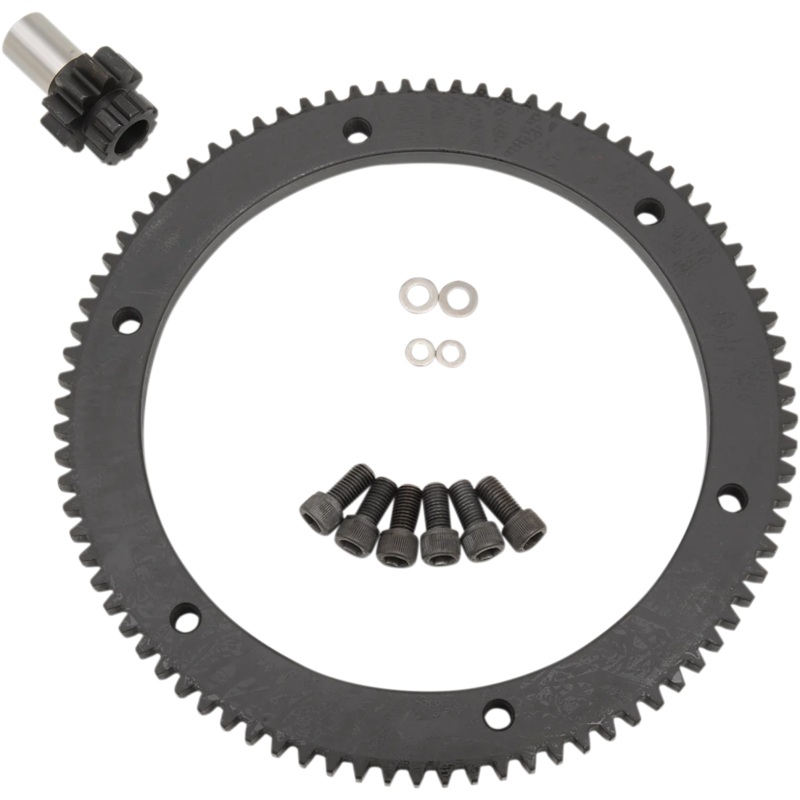 Features a 10-tooth pinion gear and an 84-tooth starter ring gear that produces 15% more starting torque than stock (9:66 ratio) gears. Gears are made of 8620 carbonized steel for strength and long life. Uses OEM clutch baskets. Reduces gear tooth breakage