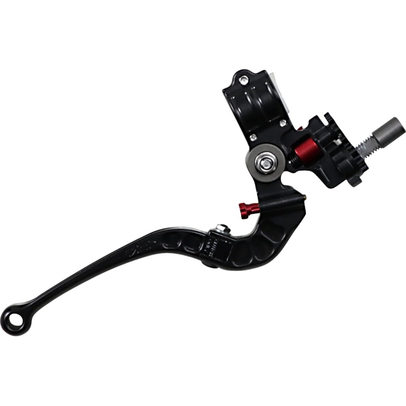 Designed for the serious street and Supermotard racer. Variable leverage ratio allows for a lighter or heavier clutch pull, and also allows for a tunable clutch modulation. 30mm, 26mm and 22mm pivot-to-anchor-center positions enable the rider to find the right ratio for the given bike or track/road condition. Large detent-style on-the-fly adjusting wheel to manually adjust for cable slack and compensate for thermal and wear changes in the system. Unique ratcheting thumb pad allows for limited adjustments (60 of turn per engagement) without the rider having to remove his hand from the grip. 16mm outer diameter shell bearings, spaced in a wide clevis configuration, for super-smooth action while eliminating lateral slop and play. Folding hinge, PTFE sleeved and heavy-load detent/ball/spring for crash protection. 6061 T-6 aluminum CNC-machined billet construction. Designed to work with a large range of motorcycles utilizing a cable-actuated clutch, and 7/8″ diameter handle bars. Made in the U.S.A..