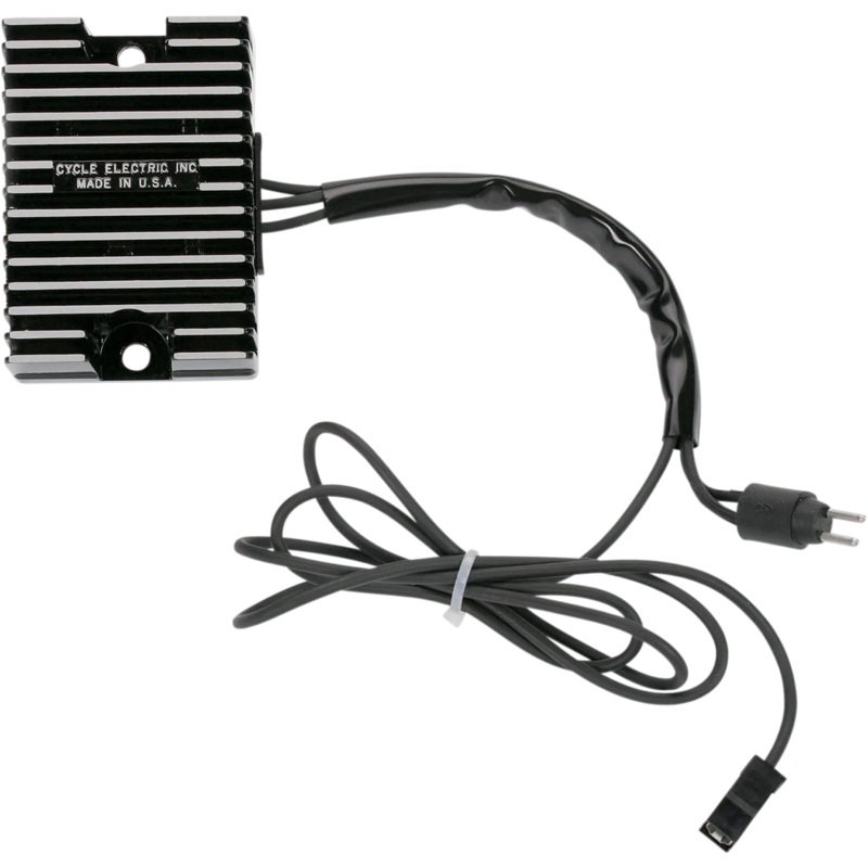 Control voltage on Harley-Davidson and Buell alternators, unlike other rectifiers or regulators that dump to ground and cause maximum stator current and higher temperatures. Cycle Electric rectifying regulators block current to control voltage; this reduces stator current, resulting in low temperature and less drag on the motor, which means more efficient operation. Made in the U.S.A..