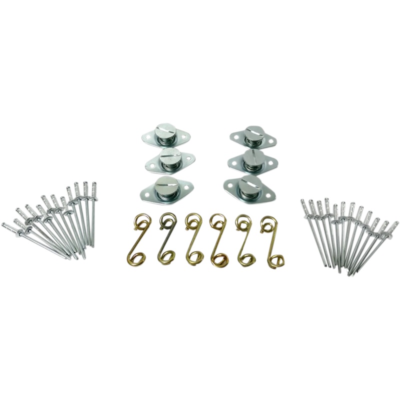 Takes the guesswork out of mounting both racing fiberglass or ABS replacement bodywork. Includes all the necessary hardware to do the job right the first time around. Each kit contains six fasteners and all supporting hardware including anti-scratch washers, rivets and springs or clips.