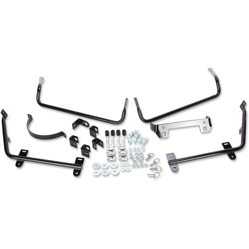 Made of high-quality steel with a black powder-coat or chrome finish. Comes with fastening mechanisms. Will work with fixed or detachable sissy bar side plates. Use '93-'13 style OEM hard-sided saddlebags which must be purchased separately. Optional Slick