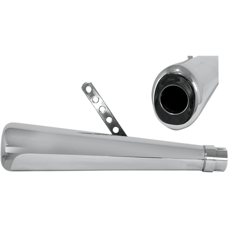 Unique oval shaped chrome megaphone that works well in tight spots. 17.5″ overall length with a 1.75″ inlet. 3.75″ x 3″ cross section measurement at the widest point. Includes inlet clamp, three-piece muffler reducer set, and universal mounting bracket. Fits right or left side.