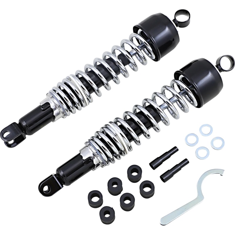 Feature a glossy black body and short upper shroud with dual chrome springs upper collar and stepped pre-load adjuster. Each shock set includes 10 mm, 12 mm and 14 mm bushings to suit all applications.