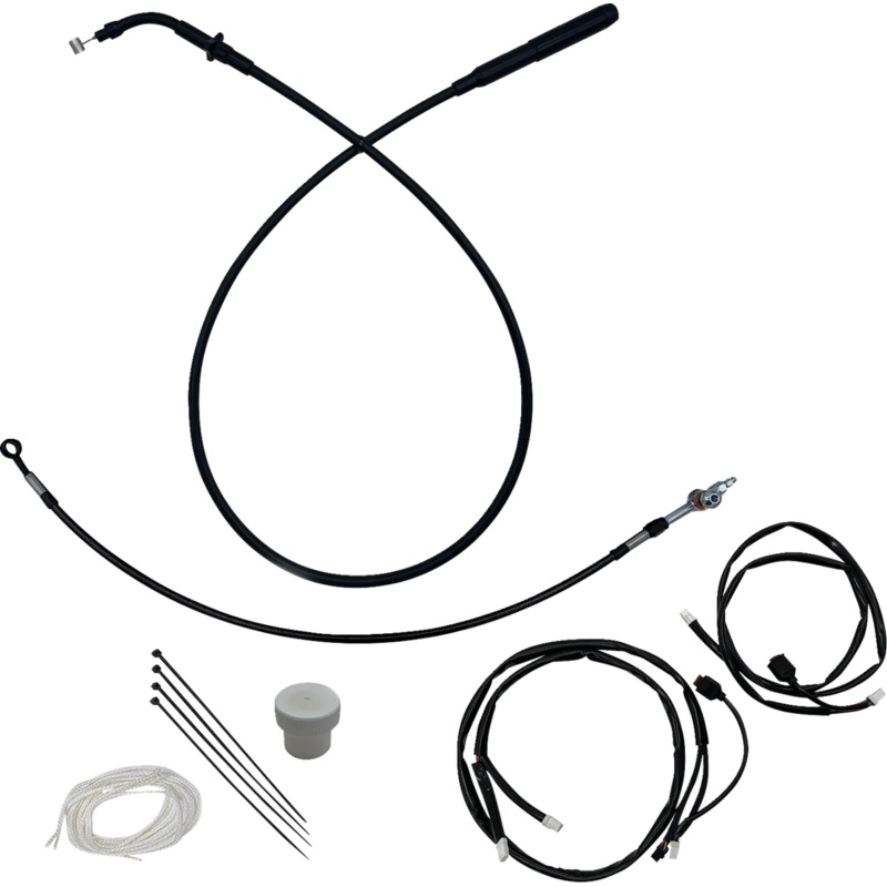 Include all of the necessary components needed to install handlebars based on your model of motorcycle and height of handlebar. Installs without removing the exhaust and draining the transmission oil. New cable adjuster placement next to clutch lever (no tools needed to adjust). Removes and replaces the OEM plastic tubes, connector & adjuster. Made in the USA. Items included in this kit:. EZ install brake line extension. EZ install upper clutch cable. Wire extensions (3 Piece kit to lengthen OEM H-D Handlebar switches & TBW sensor). Ropes. Zip ties. Lube.