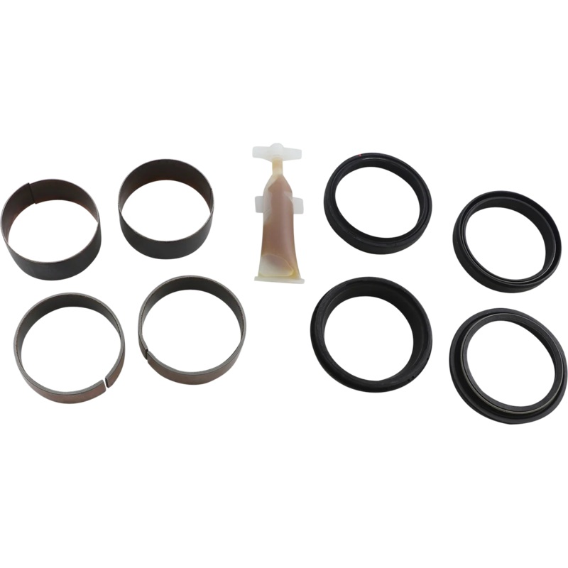Contains everything needed to rebuild a set of front forks. Each kit includes grease, two oil seals, two dust seals, two piston metal sets and two slide metal sets. Order one kit per bike.