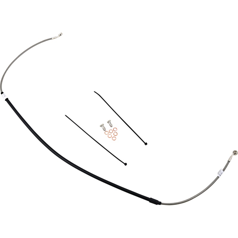 64 braided strands of steel around the line, making the line have zero expansion at any time – better than any other braided line. Requires less pressure at the lever, allowing the rider to use less force while stopping the bike faster and with better feel. Fittings come from the factory pre-positioned but can swivel 180 if necessary to make the installation process easier. Includes a clear outer coating which protects the bike from scratches and the lines from humidity. Complete with all necessary banjo bolts and washers. Ready to install.