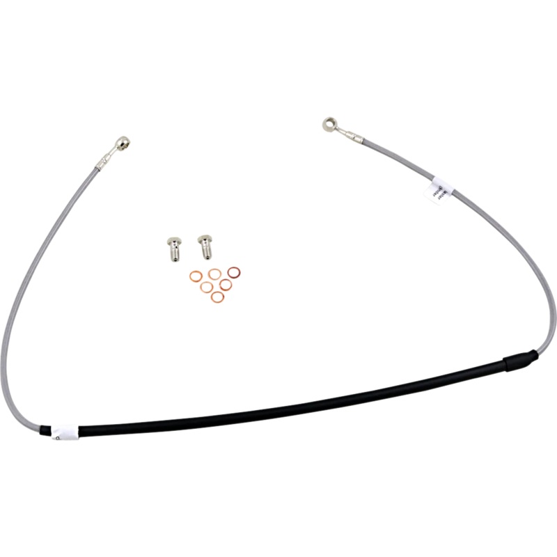 64 braided strands of steel around the line, making the line have zero expansion at any time – better than any other braided line. Requires less pressure at the lever, allowing the rider to use less force while stopping the bike faster and with better feel. Fittings come from the factory pre-positioned but can swivel 180 if necessary to make the installation process easier. Includes a clear outer coating which protects the bike from scratches and the lines from humidity. Complete with all necessary banjo bolts and washers. Ready to install.