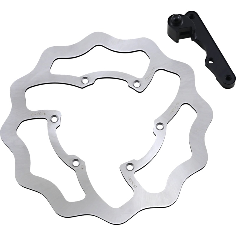 270 mm solid-mount brake rotor. Kit includes 6061-T6 aluminum relocating bracket. Designed for track, trail, and everyday use. Keeps the brake system cooler by allowing air to pass over every point of a brake pad surface. Best friction surface of any stainless steel brake rotor. Drastically increases lever feel, modulation and brake torque.
