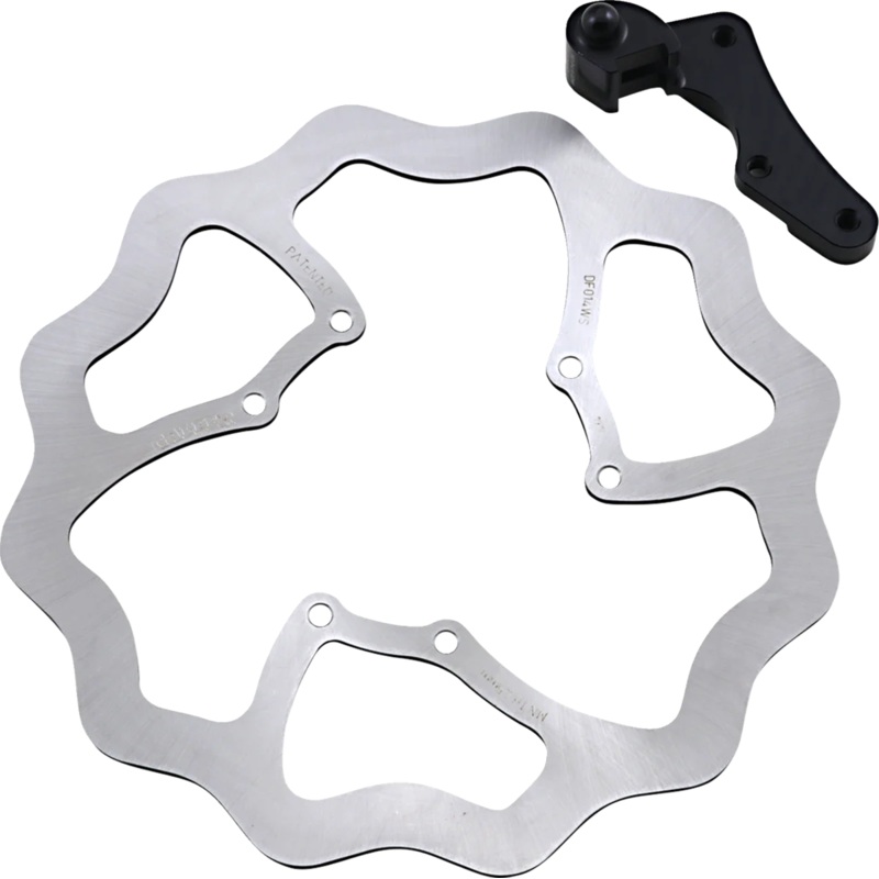270 mm solid-mount brake rotor. Kit includes 6061-T6 aluminum relocating bracket. Designed for track, trail, and everyday use. Keeps the brake system cooler by allowing air to pass over every point of a brake pad surface. Best friction surface of any stainless steel brake rotor. Drastically increases lever feel, modulation and brake torque.