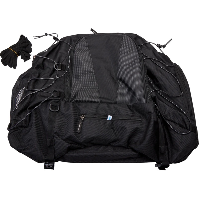1200-denier Technolast water-resistant, UV-treated polyester construction. Large main compartment and two smaller side pockets. Unique anchor knot attachment system features anti-slip cam buckles. Anti-scratch base. Rain cover with pocket. Installs over the passenger seat and part of the tail section; fits bikes with a tail section width of 10.2″ or less. Measures 15″ L x 27″ W (front; 20″ rear) x 16″ H (from top of bag to bottom of overlapped sides); 7″ H from top of bag to seat in front (5″ in rear).