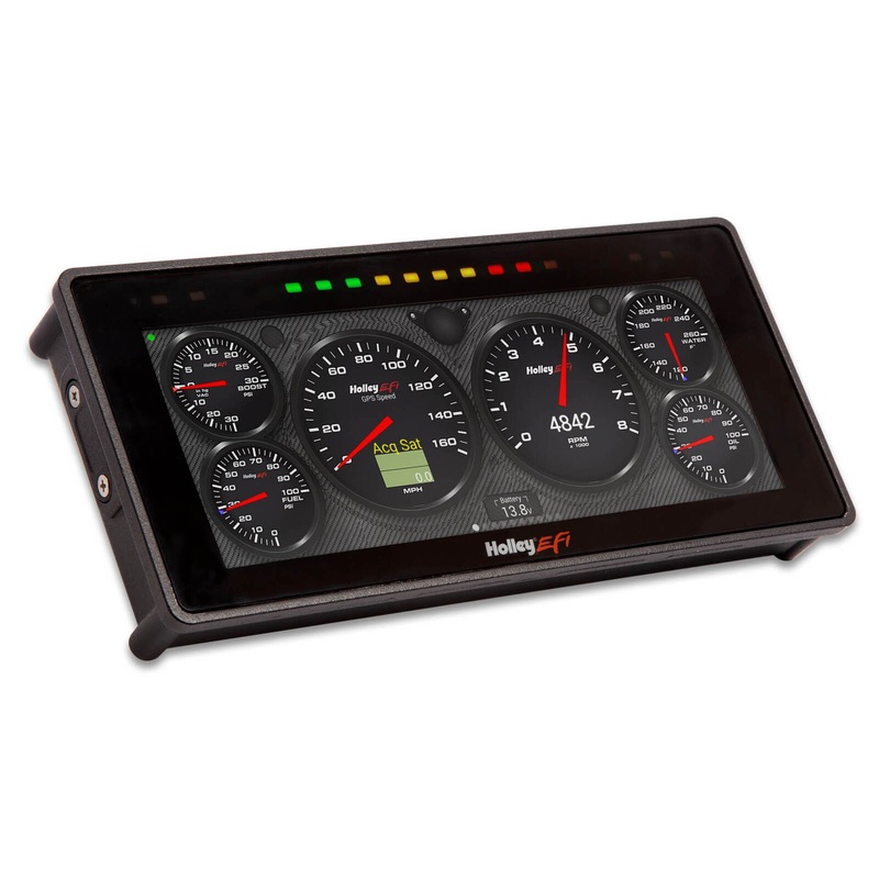 • Standalone digital dashes for installation in most any vehicle no ECU or fuel injection required. As easy to install as traditional gauges! Two models available: 6.86 version is big on features, but small on size for installation almost anywhere! 12.3 version is for the hard-core enthusiast who wants the ultimate display device!High resolution, state-of-the-art, multi-gauge touch-screen display with fully configurable layouts: Full color, capacitive touch screen with auto dimming offers crystal clear data at your fingertips day or night no stylus needed Quickly swipe between multiple active screens (tune, warm-up, race, drive, etc.) Virtual switch panel eliminates the need for external toggle switches 16 default backgrounds skins pre-loaded with unlimited options for importing custom layouts Built-in GPS with speed, odometer and trip odometer function (external antenna included) Integrated 10-LED programmable shift light w/ 4-LED warning indicators for other sensor inputs. (6.86 dash only) Rendered analog (dials / needles) and digital gauge styles available Integrated datalogger Rugged, water resistant case is constructed of cast aluminum for long life and durability Plug and play features are pre-configured in the harness and include dash layouts / screens for:: Oil and fuel pressure, coolant and air temp (utilizes plug and play Holley sensors, not included) Turn signals High beam Fuel level Engine vacuum / boost Additional input and output functionality: 13 multi-configurable inputs 4 ground switched outputs Four speed channels (two dedicated) for RPM, driveshaft speed, or any other Hall effect speed input User definable channel alarms and warnings Communications / Harness: 4 Pin Wiring Harness contains Power, Ground and CANbus connections Holley EFI CANbus connection for expanded capability with Holley EFI systems Expandable storage via USBIntegrated Datalogger: Internal Log Memory 1 GB (expandable up to 32GB with addition of micro-SD card) External Logging to USB Flash Drive is also available for easy file management On-screen datalog playback allows you to review vital run information right on the dash Full analysis via laptop is available. Simply download the file to a USB drive and view with the free datalog viewer at Holley.comFlexible mounting options: Surface or flush mounting, with high quality hardware includedSimple setup and programming: USB Keyboard and Mouse functionality makes it quick and easy to setup new layoutsFully Upgradeable: Upgradable with future software enhancements Can easily be converted for use with Holley EFI to monitor up to 238 real-time values such as RPM/TPS/Boost Compatible with Holley EFI Plug and Play Programmable Shift Light – Part Number 553-107Whats Included: Both dash versions include harness / cables, mounting hardware, USB memory stick and CAN terminator GPS Antenna Sensors not included