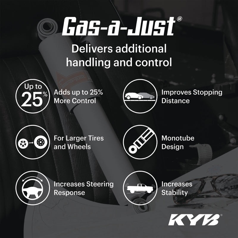 The KYB Gas-a-just monotube shock absorber has additional performance advantages over the traditional twin-tube design: It can instantly, automatically adjust to your performance needs and never experiences fade due to aeration. The KYB Gas-a-just has two