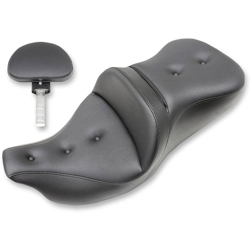 Refined split-cushion design separates the seating surface from the lumbar support to reduce tailbone/back pressure for maximum long-range comfort. Seat features a combination of progressive density foam and SaddleGel inserts for superior driver and passenger comfort. Pillowed soft upholstery cover backed by a compliant foam layer under the cover to provide incredible comfort and style. Moves driver 2 further back from stock and standard RoadSofa seating position. Tall lumbar support and wide driver saddle supports the back and legs for superior comfort, while the streamlined nose improves the rider’s reach to the ground. Classic styled button-tufted cover. Made in the USA.