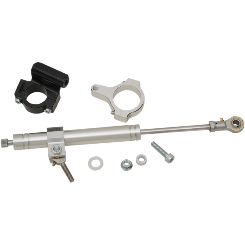 Specially designed for each application. Kits include an individual length of stabilizer and complete bolt-on brackets without rivet mounting for easy and secure installation. Dampen unwanted fork oscillations (speed wobble). Seven-position hydraulic steering dampers. Fully adjustable; allows full-fork movement from stop-to-stop. Includes required mounting hardware and instructions for installation.