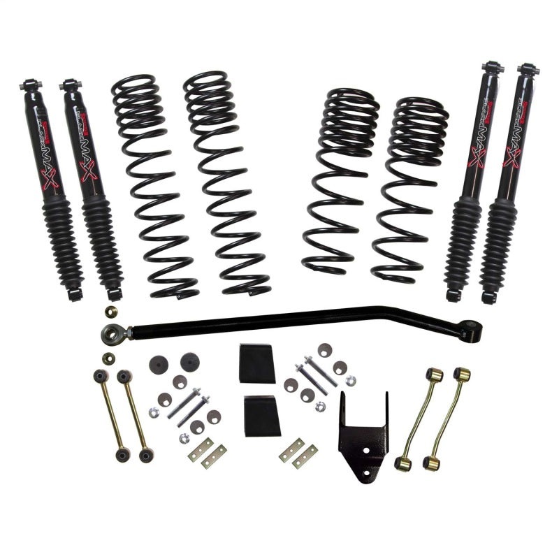 The biggest determining factors in ride quality and suspension performance are coil springs and shocks. Skyjacker specifically engineered a progressive 2-stage dual rate long travel coil. Spring rate progression is from a 1st Flex Rate to a 2nd Ride Rate. The 1st Flex Rate stage delivers a comfortable ride with the ability to flex for increased articulation. The flex rate expands during full articulation as the suspension drops (full droop). This keeps the coil springs seated in the upper coil mount/bucket and the tires in contact with the terrain. The 2nd Ride Rate stage only engages after compression past the flex rate. Engineered to coordinate with the Wranglers distinctive suspension handling characteristics, the rear coils are side specific. Shocks are a key link in-between the chassis and your suspension. Their key role is to dampen out or control the terrain to keep your tires in contact with the terrain. Front damper capacity enhanced with Black MAX Shocks. Black MAX Shocks have specific valving and stroke for this application. Black MAXs Advanced Foam-Cell technology increases performance and style to deliver a smooth, comfortable ride. The replacement Front Adjustable Track Bar includes Skyjacker installed pressed-in HD OEM style rubber bushing and an adjustable 3/4-inch Heavy-Duty Rod End, Jam Nut and Alignment Bushings. A heavy duty Rear Track Bar Upper Mount Bracket is included to center the axle under the vehicle properly. Front and Rear Bump Stop Spacers bolt onto the axle bump pads and keep the suspension travel safely in check. Front and Rear Extended Length Sway Bar End Links allow full articulation as the suspension drops (full droop). These sway bar end links include Skyjacker installed pressed-in HD OEM style rubber bushings.